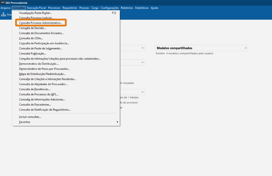 1. No SAJ acesse o menu Consultas e clique na opção Processo Administrativo.