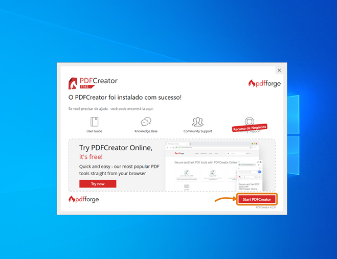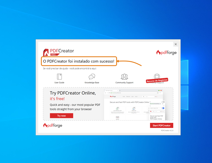 Passo 3: ao ser concluído o procedimento, será exibida a mensagem “O PDF Creator foi instalado com sucesso.”