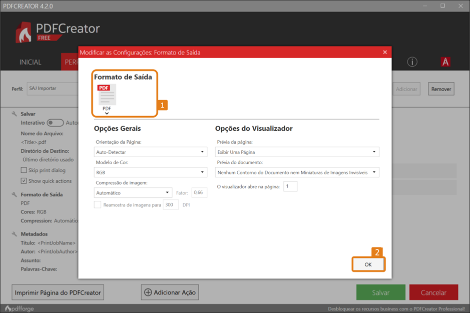 Passo 7: na tela ‘Modificar as Configurações: Formato de saída’, selecione o formato do ‘arquivo’ (1) (use, preferencialmente o formato PDF) e clique em ‘OK’ (2).