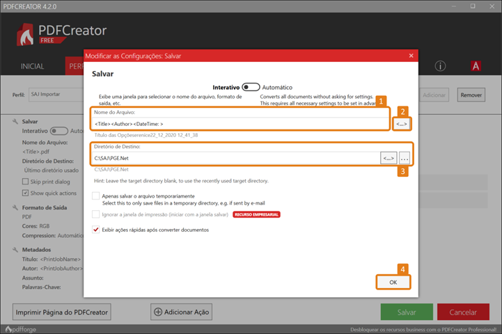 Passo 9: na tela ‘Modificar as configurações: Salvar’, campo ‘Nome do Arquivo’ (1) informe a configuração que deve ser aplicada na geração do nome dos arquivos. Utilize o padrão que preferir, clicando na seta ao lado do campo (2), selecione a opção desejada. No exemplo, o PDF gerado será nomeado unindo o nome do arquivo, nome do autor e a data de impressão.