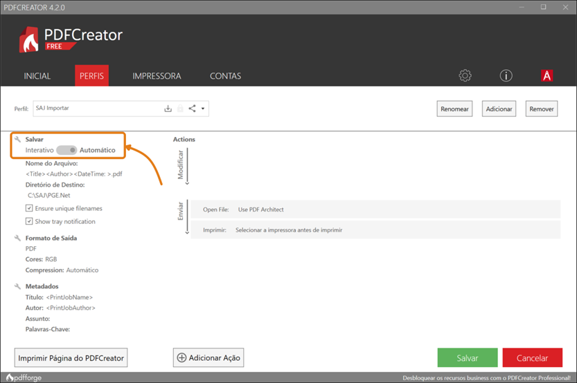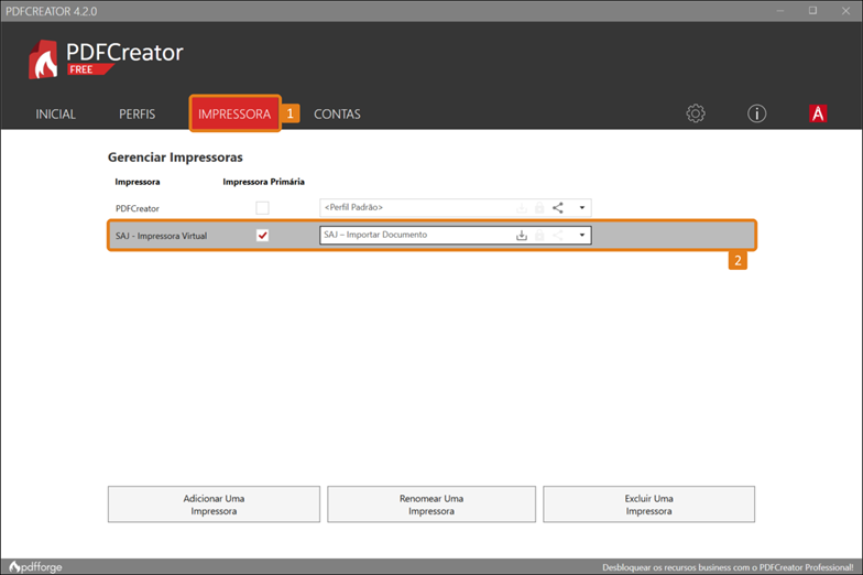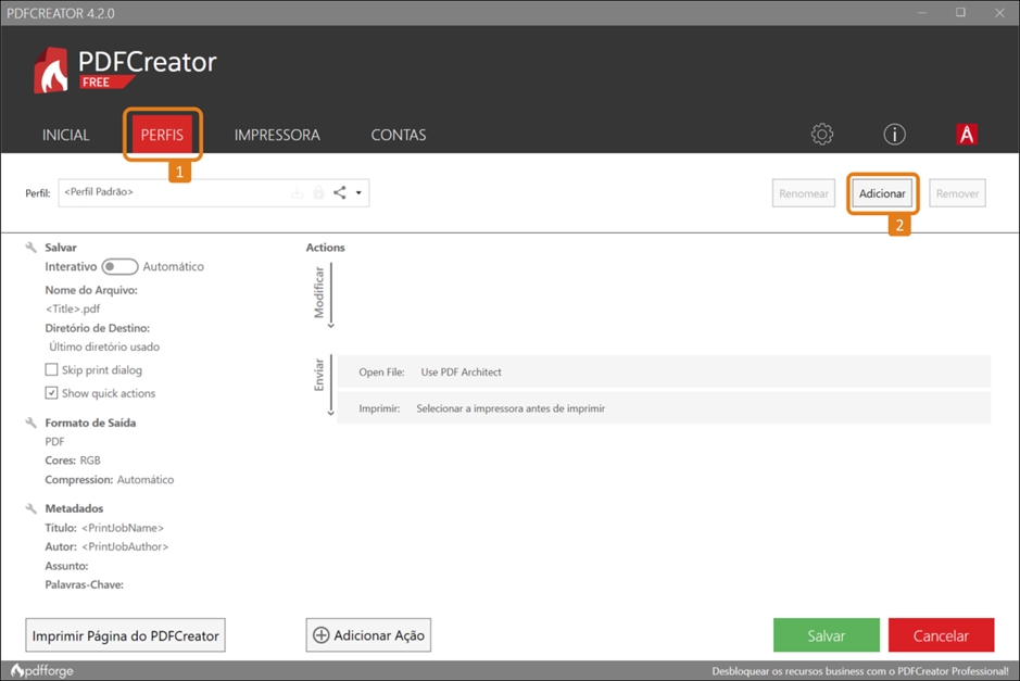Passo 5: a janela de configurações do PDF Creator será exibida. Clique na aba ‘Perfis’ (1) e em ‘Adicionar’ (2), no canto superior direta da tela, para adicionar um novo perfil à sua impressora.