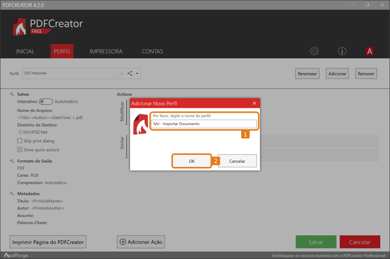 Passo 6: informe um ‘nome’ (1) para o seu perfil, como por exemplo “SAJ – Importar Documento” e na sequência clique em ‘OK’ (2).