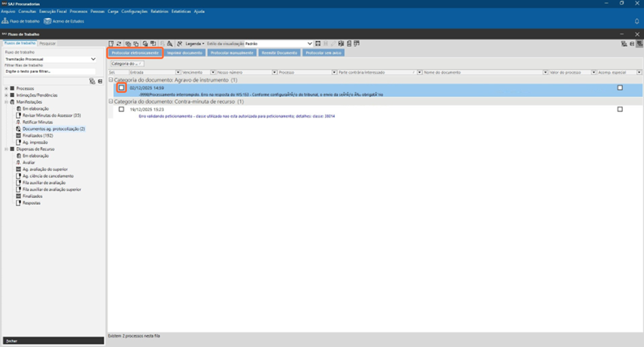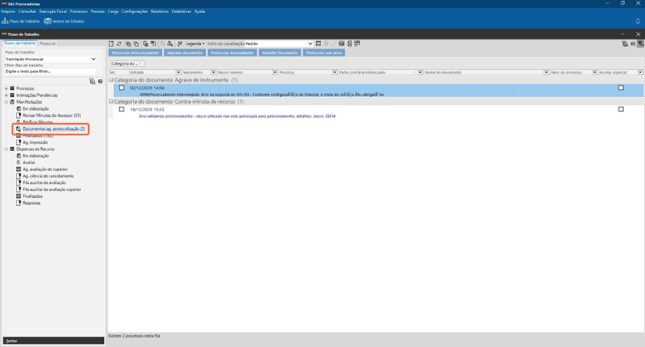 AtençãoAcompanhar essa fila é de fundamental importância na rotina do procurador, pois, enquanto permanecem nela, as manifestações não são devidamente protocoladas e os prazos das pendências continuam sendo contabilizados. Caso um documento seja movido para essa fila e não seja revisado a tempo, pode ocorrer a perda do prazo e, consequentemente, diversas implicações legais.
