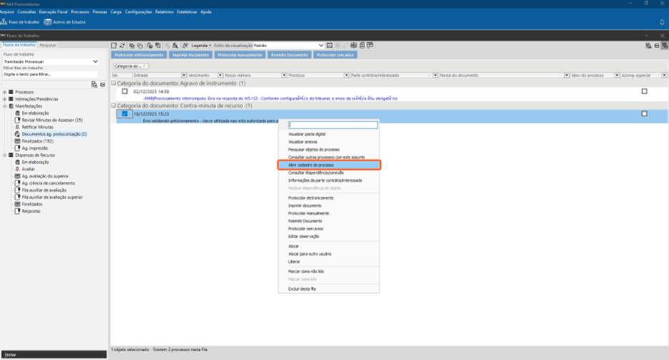 Passo 2.2: em situações em que há algum dado inválido no peticionamento, indicadas por observações do tipo 'Erro relacionado com a Classe do cadastro do processo', ajuste os campos necessários ou entre em contato com o suporte técnico. Para ajustar os campos, clique com o botão direito do mouse sobre a pendência (1) e, em seguida, clique na opção 'Abrir Cadastro do Processo' (2).