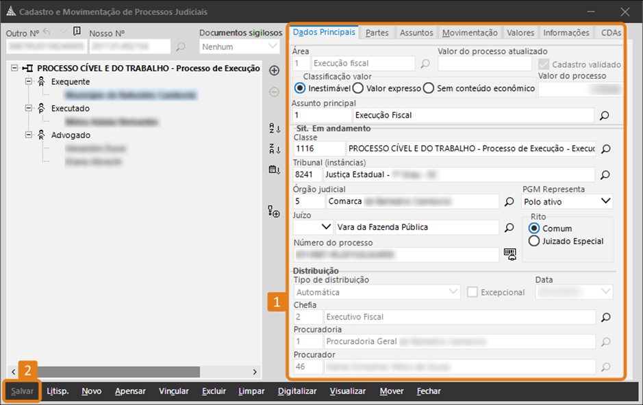 Passo 2.2.1: abra a tela de cadastro do processo e confira os campos, como tribunal, vara, juízo, dados das partes etc. (1). Ajuste o que for necessário e clique em 'Salvar' (2), no canto inferior esquerdo da tela.