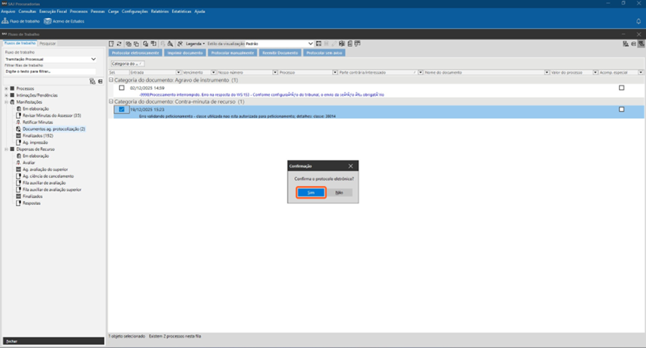 Passo 2.1: caso a instabilidade já tenha sido resolvida pelo Tribunal, o documento será protocolado e a pendência será encerrada. Caso contrário, ele continuará sendo exibido na fila em questão. É importante manter-se atento para realizar o peticionamento na data prevista.