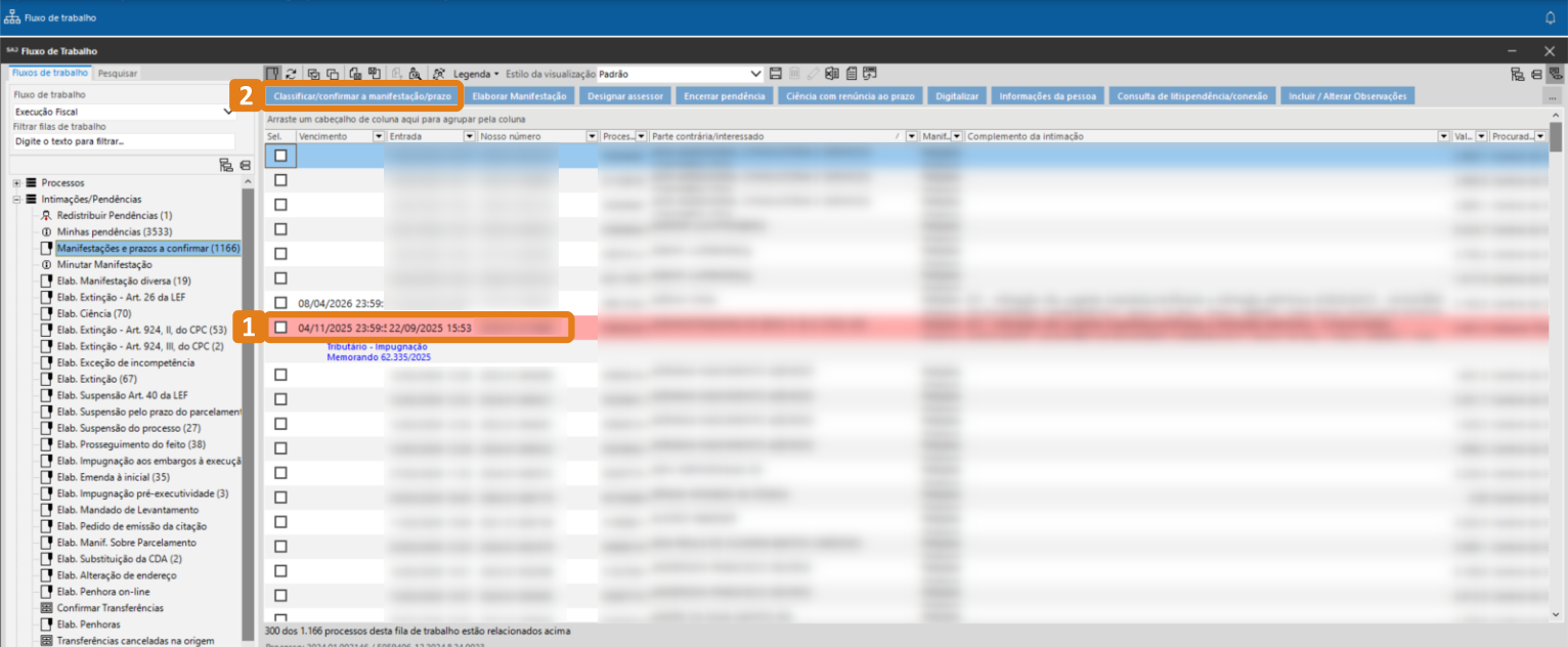 1. Em seu Fluxo de trabalho, selecione a pendência desejada (1) e, em seguida, clique na atividade Classificar/Confirmar a Manifestação/Prazo (2), localizada na barra de atividades logo acima da lista de pendências.