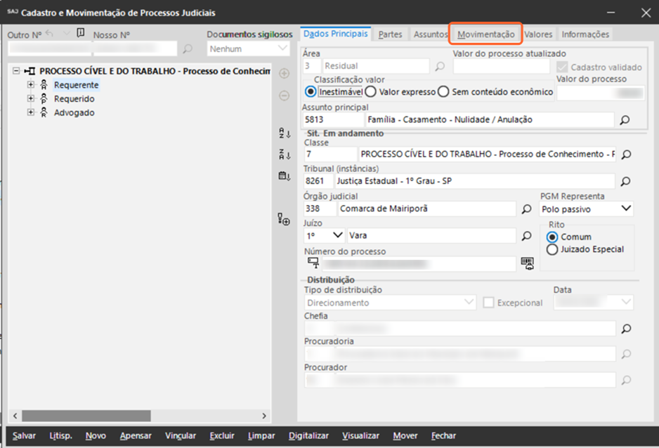 3. Uma vez carregados os dados do processo, acesse a aba Movimentação.