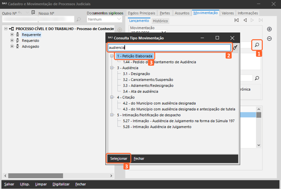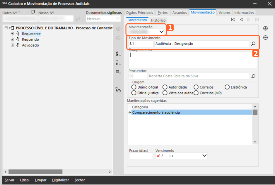 Passo 5: informe a data de lançamento da ‘Movimentação’ (1) e o ‘Tipo de Movimento’ (2), que, neste caso, é a ‘Designação de audiência’.