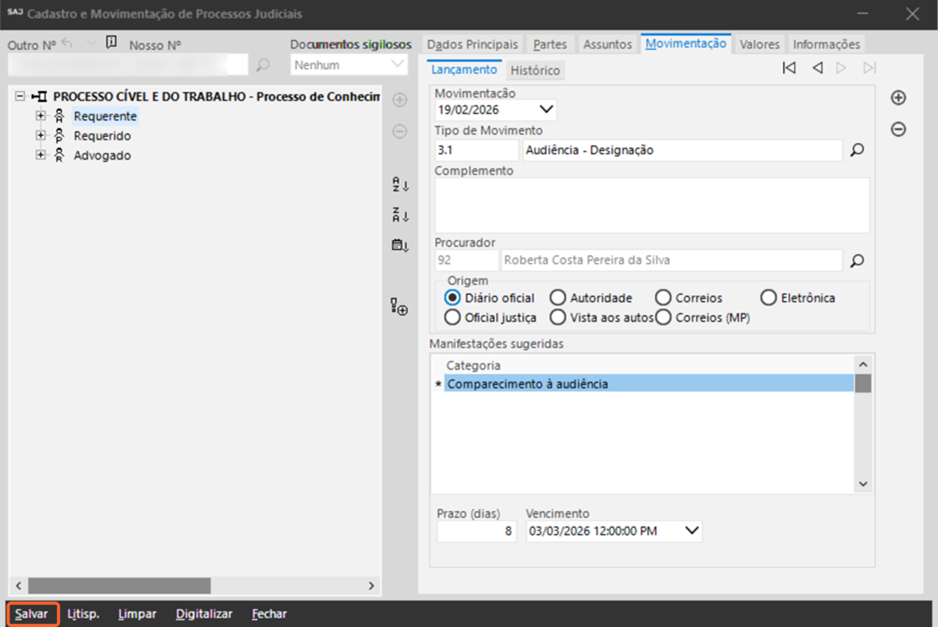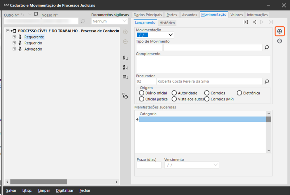 Saiba maisPara que o campo Procurador esteja desbloqueado, é necessário habilitar no SAJ ADM a opção Permite informar um procurador diferente do vinculado ao processo. Para saber como configurar essa opção, acesse o artigo: