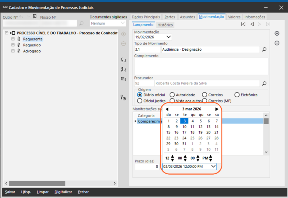 Passo 7: preencha o ‘Vencimento’, informando o dia e o horário da audiência. Clique na seta para baixo disponível no campo e selecione no calendário a opção desejada. O ‘Prazo (dias)’, que representa o período entre o cadastro da movimentação e o vencimento da audiência, será preenchido automaticamente após a definição do vencimento.