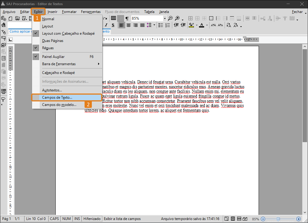 1. Com o Editor de textos aberto no modelo em questão, acesse o menu Exibir (1) e clique na opção Campos de Texto (2).