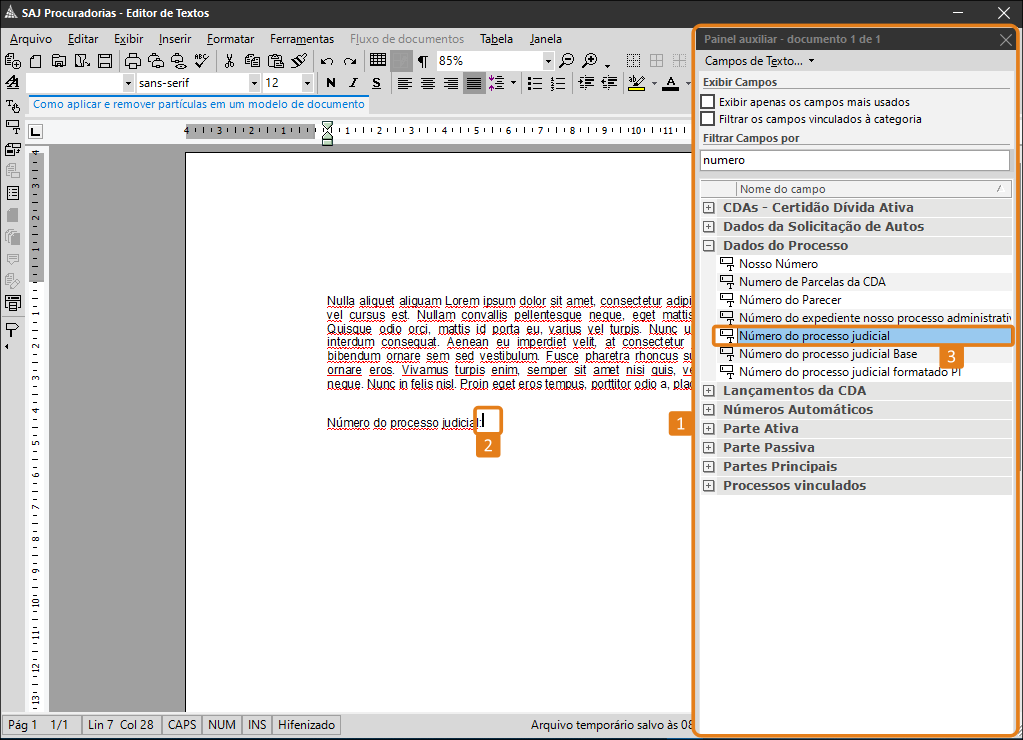 DicaA tela Campos de texto pode ser acessada, também, por meio do atalho Shift + X.2. Neste momento o sistema exibirá o Painel auxiliar no lado direito da tela (1). Com ele aberto, posicione o cursor na parte do documento onde deseja inserir a partícula (2) e, em seguida, localize entre as opções disponíveis, a partícula desejada (3).
