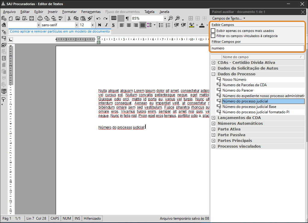 DicaPara facilitar a sua pesquisa pela partícula desejada, utilize os filtros e o campo de busca disponíveis na parte superior do Painel auxiliar.3. Uma vez localizada a partícula desejada (neste exemplo, vamos utilizar a partícula Número do processo judicial), clique duas vezes sobre ela para aplicá-la ao seu documento.