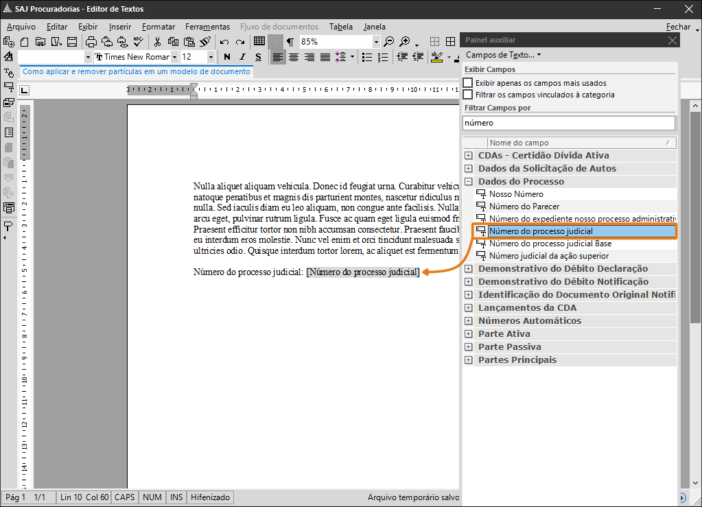 Pronto, a partícula foi excluída e agora já não traz a informação indicada (este caso, o número do processo judicial). Para todos os novos documentos elaborados a partir deste modelo de documento, a partícula não vai mais constar.