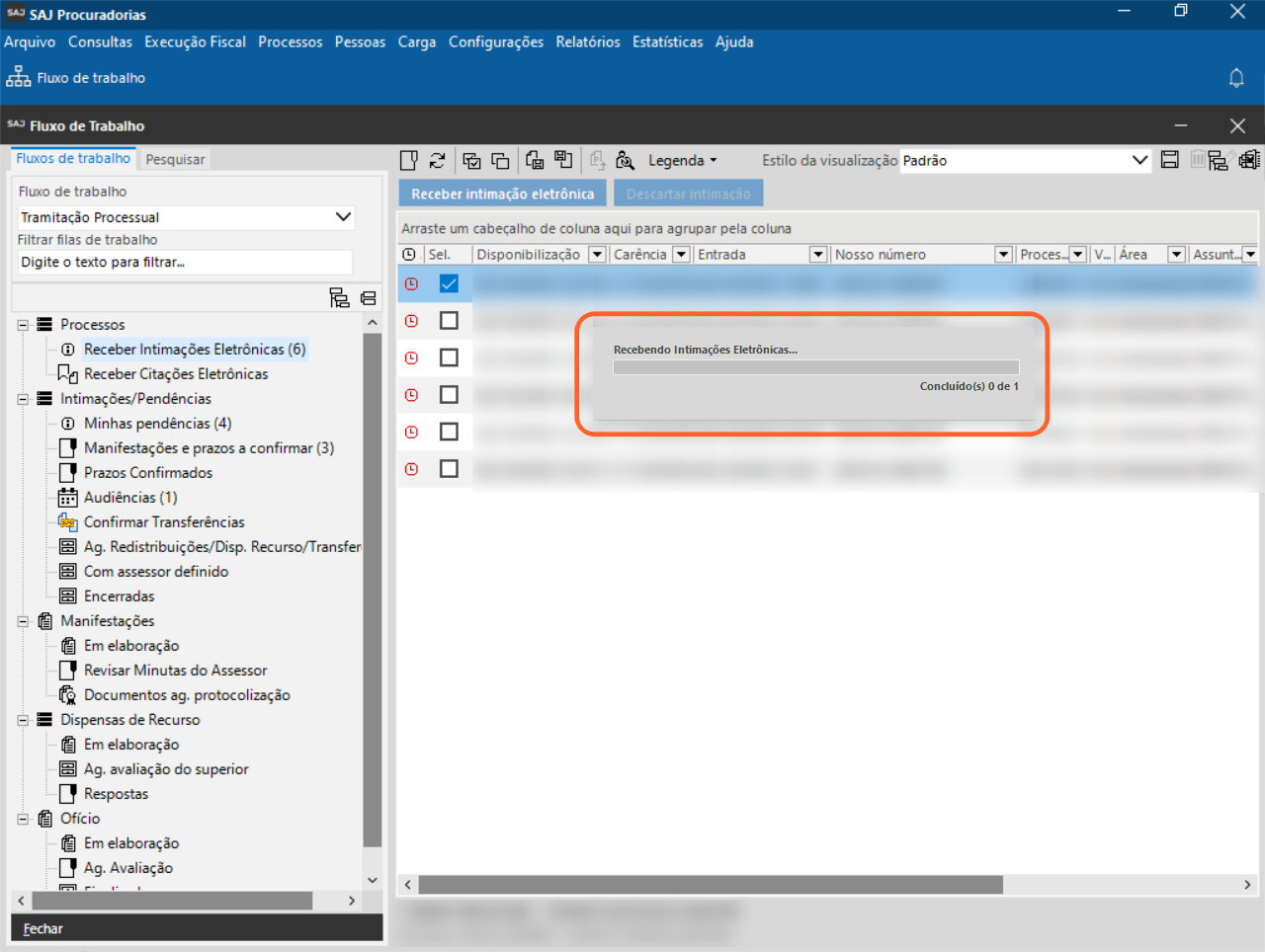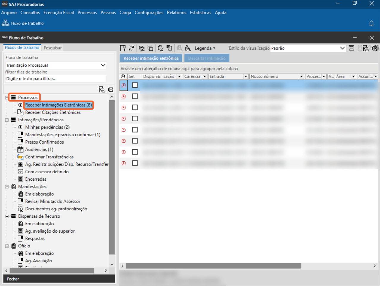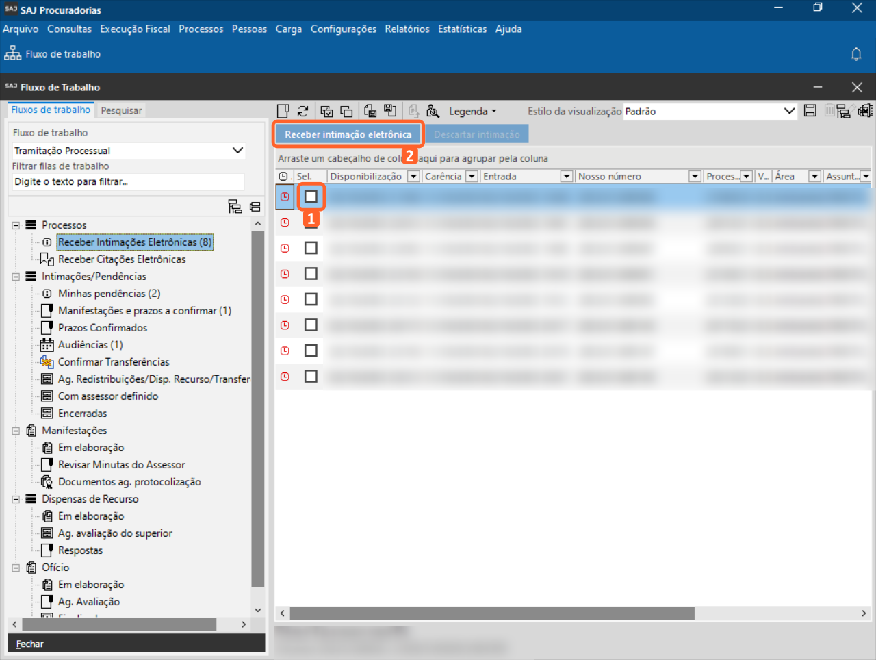 2. Selecione o subfluxo ‘Processo‘ e clique na fila ‘Receber Intimações Eletrônicas‘.
