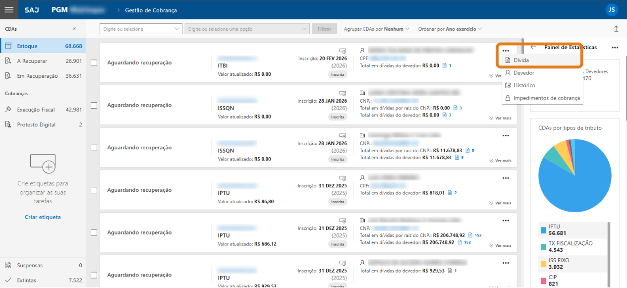 1. No módulo ‘Gestão de Cobranças’, clique no ícone representado por “três pontos” que está localizado no lado superior direito da CDA desejada e, em seguida, clique em ‘Dívida’.