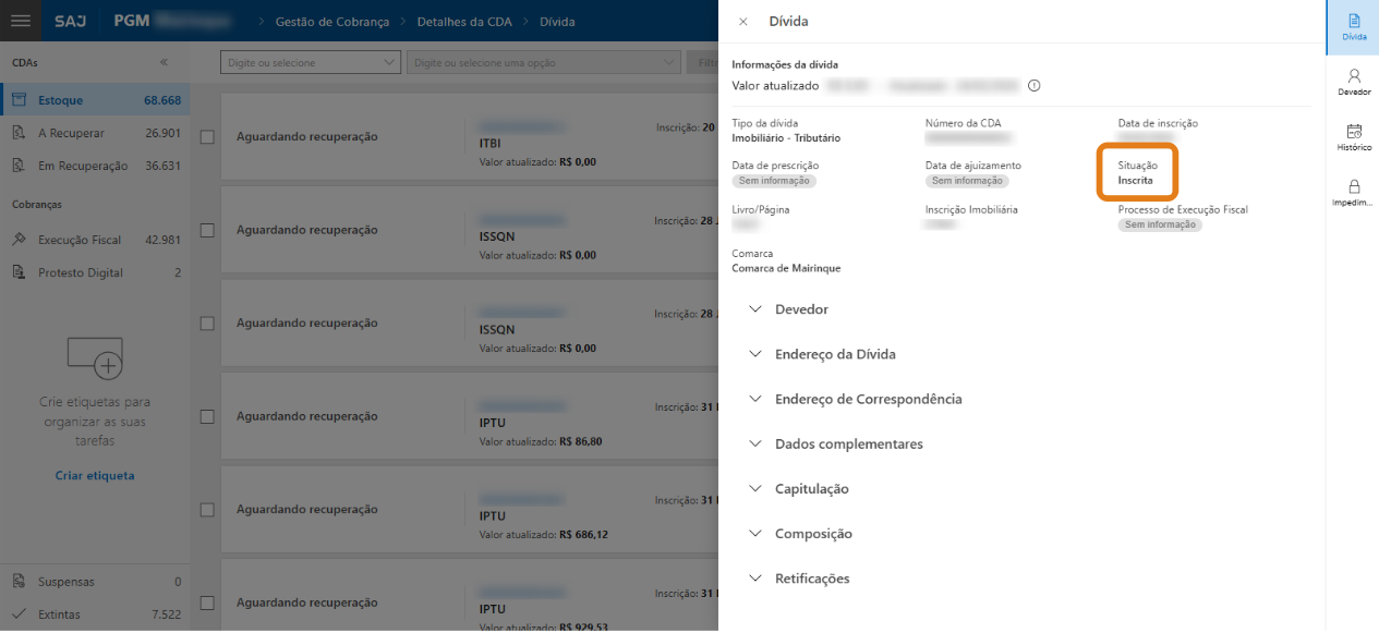 3. Com isso, uma nova tela vai aparecer no lado direito no sistema com as informações da dívida disponíveis. Veja que, a situação da dívida está presente.