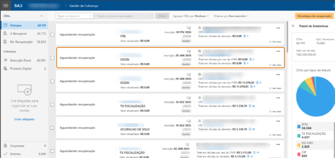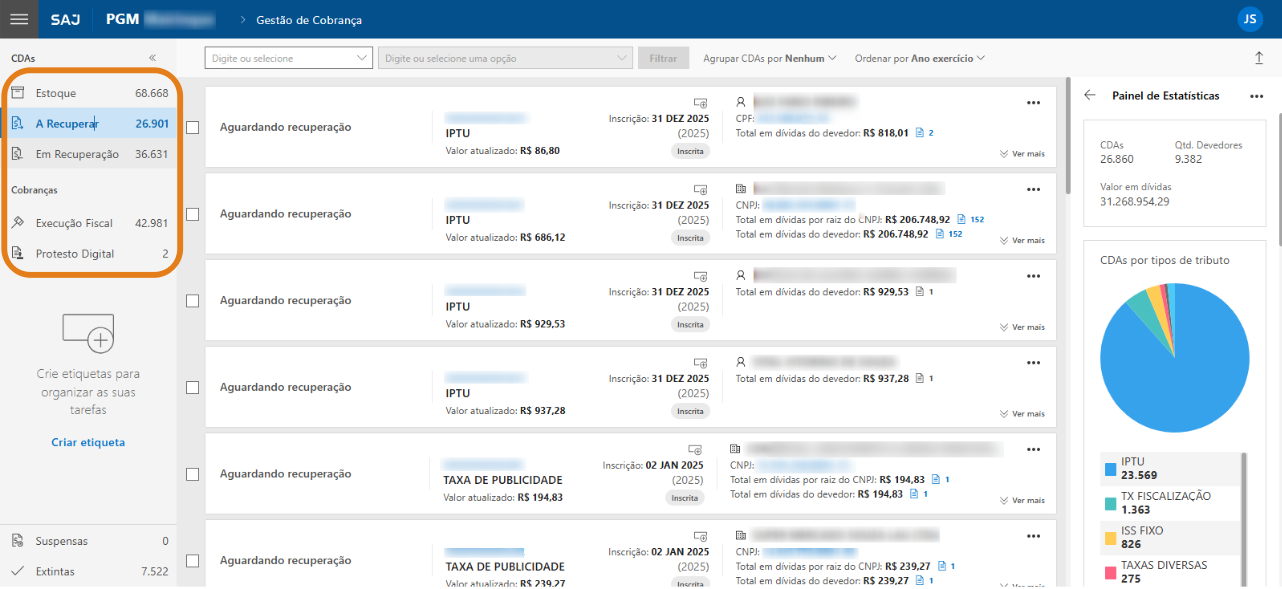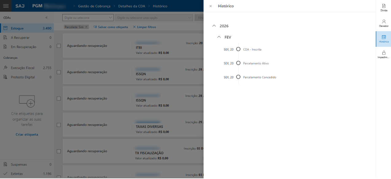 Publicado em: 26/03/2026Por meio do módulo de Gestão de Cobranças é possível visualizar os dados de uma CDA e a forma de navegação permite a visualização da situação com poucos cliques.