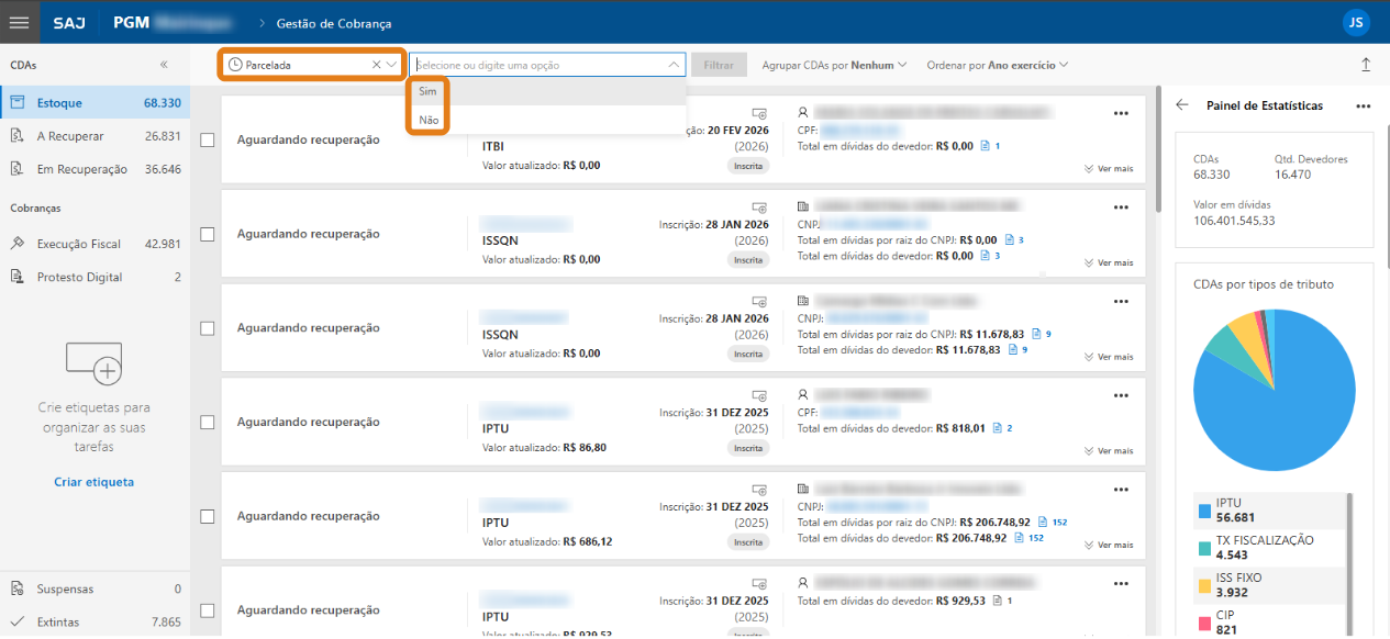 Antes de tudo, é importante destacar que o Gestão de Cobranças dispõe de diversos filtros que contribuem significativamente para a busca de CDAs. Neste exemplo, utilizaremos o filtro de Parcelada. Acompanhe na prática!
