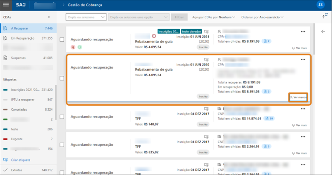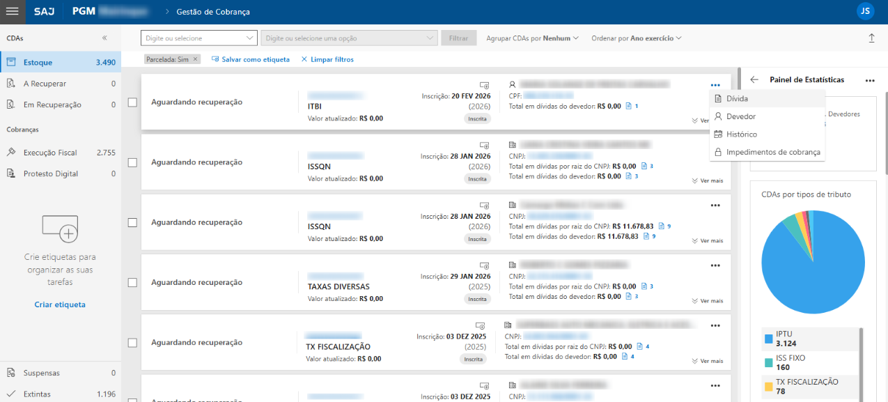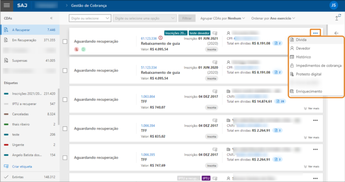 3. No centro da tela, é possível visualizar os cards que podem agrupar informações como status da dívida (que pode variar de acordo com o menu selecionado), número de inscrição da dívida, tipo de imposto, valor da CDA, data de inscrição e os dados do devedor. Clique no botão com ícone de “três pontos” caso deseje visualizar mais informações.
