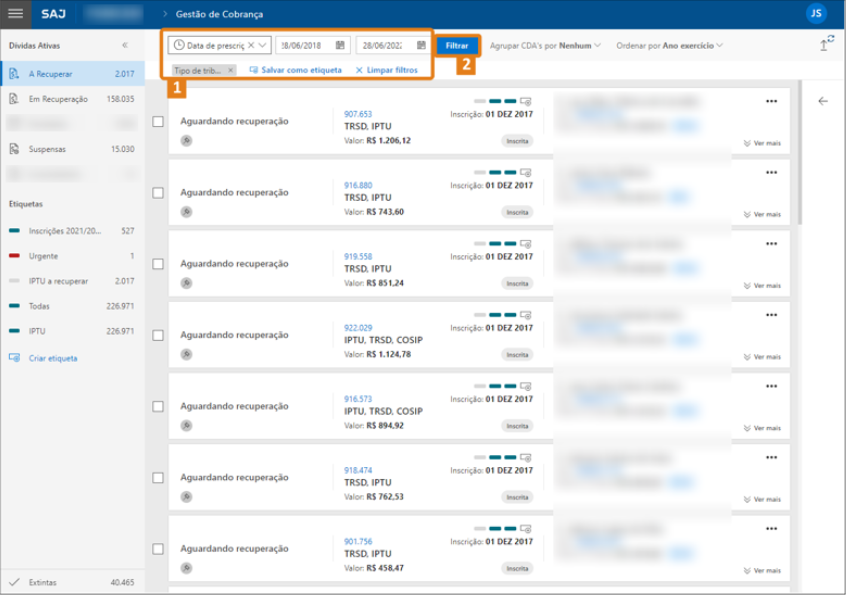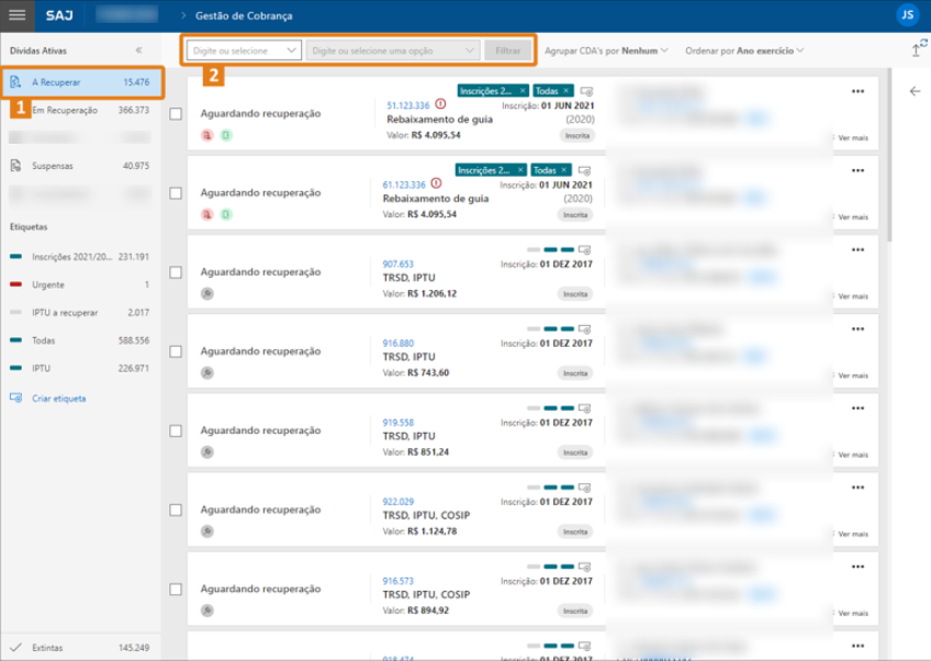 1. Clique no menu ‘A Recuperar’ (1) para fazer uma consulta. Você verá os ‘filtros’ na parte superior da página (2).