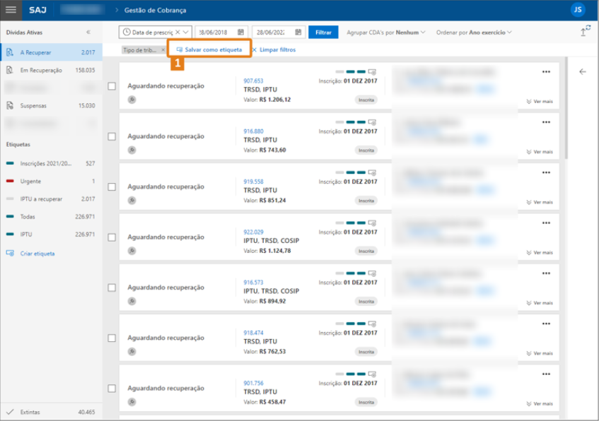 As etiquetas funcionam como uma forma de marcar um conteúdo para organizar seu trabalho de forma mais personalizada, ela basicamente guarda uma consulta das CDAs para que você não precise repeti-la toda vez que precisar. O módulo gestão de cobranças também permite que você crie suas próprias etiquetas, tornando assim, suas atividades diárias mais personalizadas.