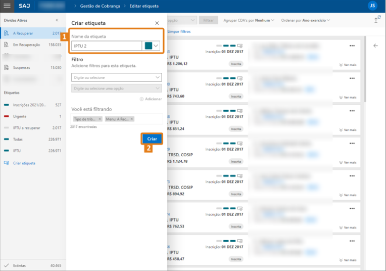 Pronto! O sistema vai apresentar a sua etiqueta criada e o sistema em tempo real vai atualizar a quantidade de CDAs de acordo com os filtros que você escolheu.