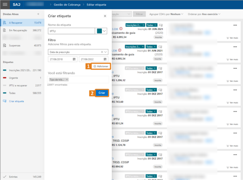 4. Para adicionar mais filtros, clique no botão ‘Adicionar’ (1). Como exemplo adicionamos o filtro de ‘Data de prescrição’ e no intervalo de data, escolhemos 27/06/2018 até 27/06/2022. Após informar o novo filtro, acione o botão ‘Criar’ (2).