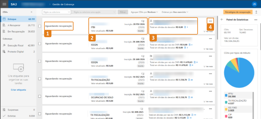 Note que o card separa as informações para melhor visualização, a primeira informação a esquerda (1) refere-se ao status da dívida, podendo variar de acordo com o menu selecionado. A segunda informação (2) refere-se ao número de inscrição da dívida, tipo de imposto e também o valor da CDA, bem como sua data de inscrição. Já a terceira informação (3) contém os dados do devedor, como o seu nome, documento, o total de dívidas e no botão representado por três pontinhos você visualiza mais informações (4).