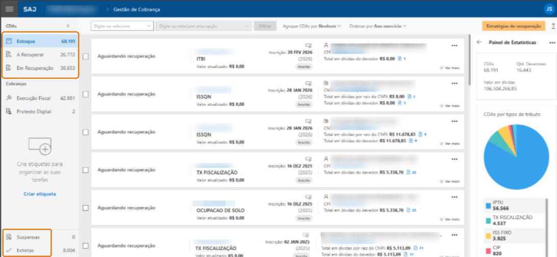 1. Ao acessar o módulo de Gestão de Cobranças, automaticamente através da situação da CDA enviada pela Secretaria da Fazenda, o estoque de dívida é agrupado por meio dos menus do sistema: