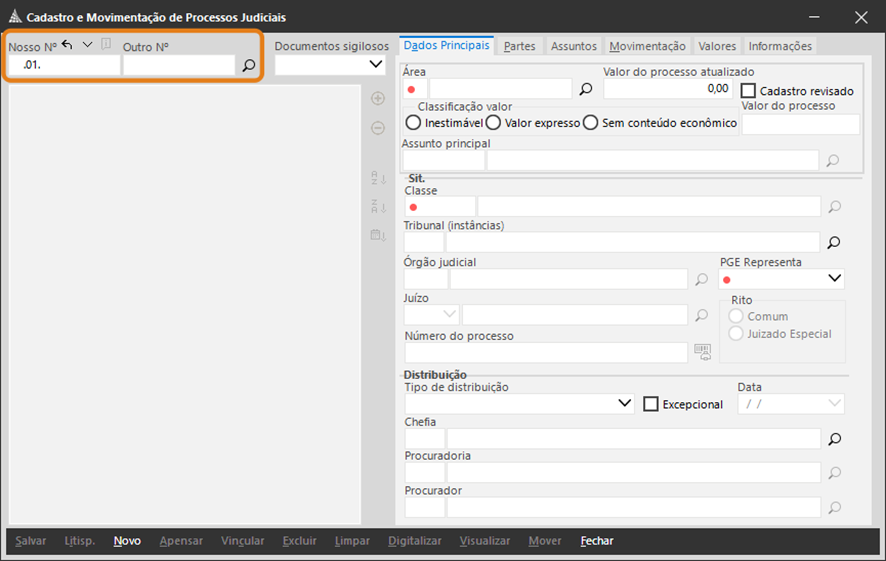 2. Na janela de Cadastro e Movimentação de Processos Judiciais, informe no campo Nosso Nº ou o Outro Nº o número do processo desejado e aguarde o carregamento automático das informações.