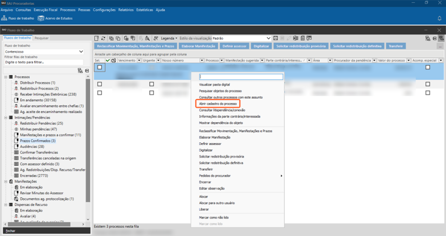 DicaVocê também pode acessar a tela de Cadastro e Movimentação de Processos Judiciais por meio da sua Agenda ou do Fluxo de Trabalho. Para tanto, clique com o botão direito do mouse sobre o processo desejado e, no menu que será exibido, clique na opção ‘Abrir cadastro do processo’.