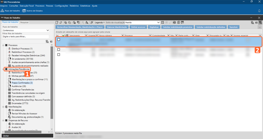 Passo 2: localize e acesse, no subfluxo de ‘Intimações/Pendências’ (1), a fila de trabalho (2) em que se encontra o processo cuja complexidade deseja consultar.