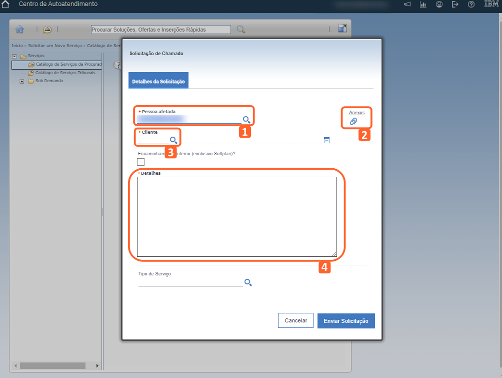 Um novo formulário será aberto, onde os dados do chamado poderão ser informados, vamos entender cada campo: