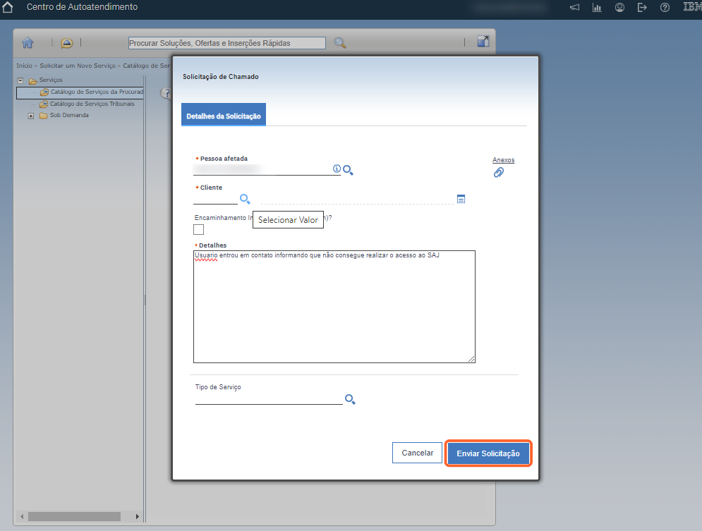 - Detalhes: Neste campo, você deverá descrever o problema que está ocorrendo, bem como seu usuário SAJ Procuradorias, lembre-se que, quanto maior a riqueza de detalhes do ocorrido, com mais celeridade conseguiremos solucionar o problema.