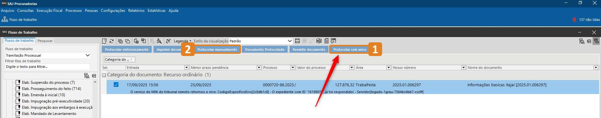 Caso ainda não tenha realizado o peticionamento, clique em "Protocolar sem aviso" (1), desta forma a petição é enviada sem vincular ao aviso do expediente. Caso já tenha sido realizado o protocolo, utilize o “Protocolar manualmente” (2), para remover a pendência da fila sem protocolizar.