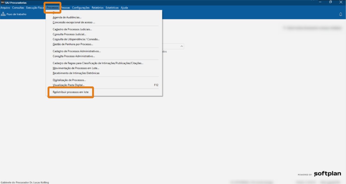 2. A tela de redistribuição em lote está acessível no SAJ Procuradorias através do menu Processos e submenu Redistribuir processos em lote.
