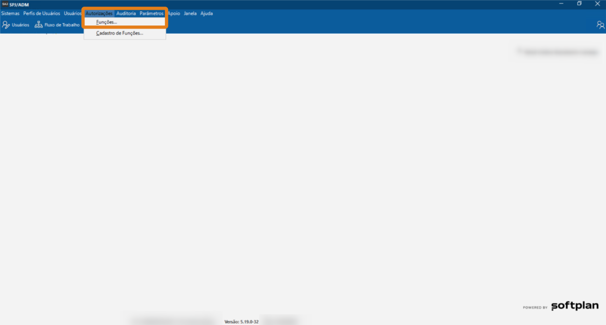 1. Para acessar a tela é necessário que você possua a função de segurança “Redistribuir processos em lote”. No sistema SAJ ADM, clique no menu Autorizações e, em seguida, na opção Funções.