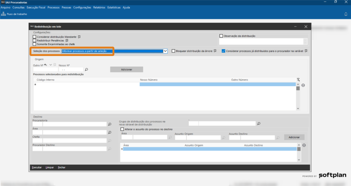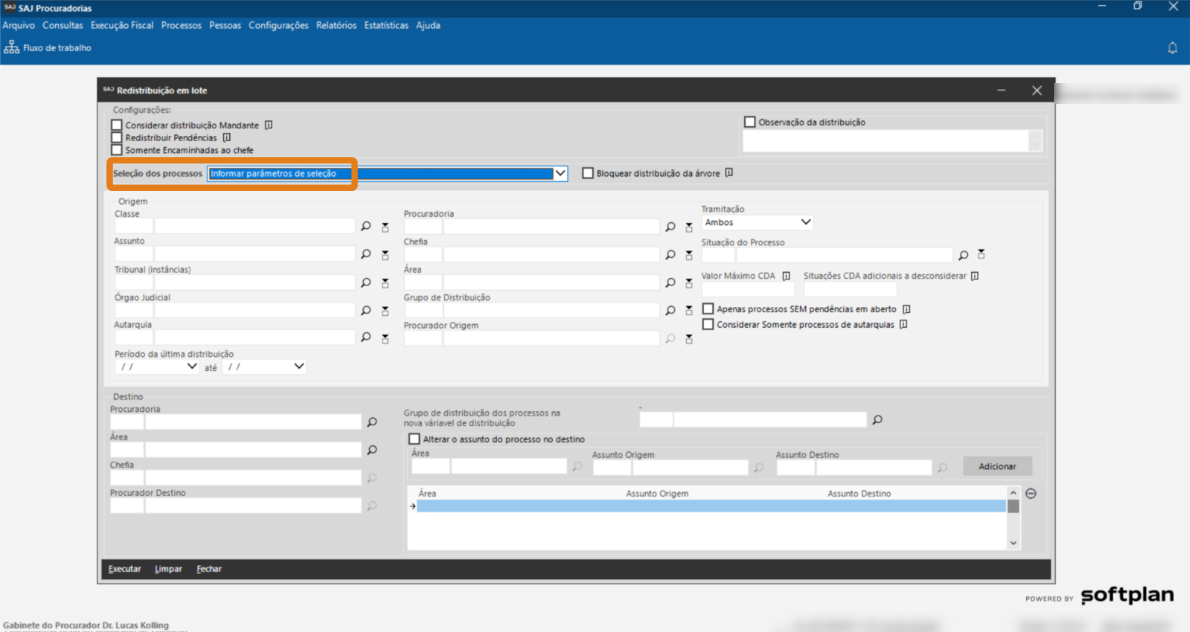 Como definir filtros de origem e destino para redistribuição em lote no SAJ Procuradorias?Versão do sistema: 5.8.1-0