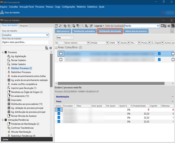 Na distribuição/redistribuição por direcionamento, o procurador-chefe faz a escolha do procurador desejado para assumir o processo ou pendência em questão; já na distribuição/redistribuição de forma automática, o procurador contemplado é sorteado conforme os critérios de peso definidos pela Procuradoria.