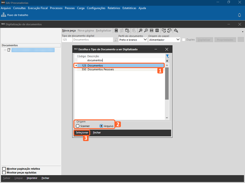 Neste exemplo, utilizaremos o tipo de documento digital ‘Documentos‘, porém no seu dia a dia, escolha a nomenclatura que mais se adequar ao documento (1), caso o arquivo já esteja digitalizado em seu computador ou na sua rede, deixe a opção ‘Arquivo‘ marcada, porém caso você tenha um scanner já previamente configurado no SAJ Procuradorias e o documento está para ser digitalizado, escolha a opção ‘Scanner‘ (2). Após escolher a opção desejada, clique em ‘Selecionar‘ (3).