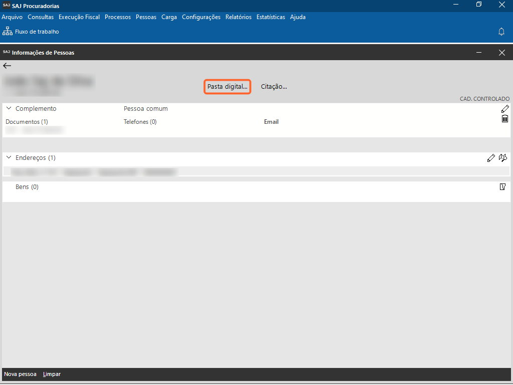 De modo organizar documentos individuais de uma parte fora de seus processos, foi criada a pasta digital da pessoa no SAJ Procuradorias. Seu funcionamento é parecido com a pasta digital processual, com a diferença que, ela não está associada a um processo.
