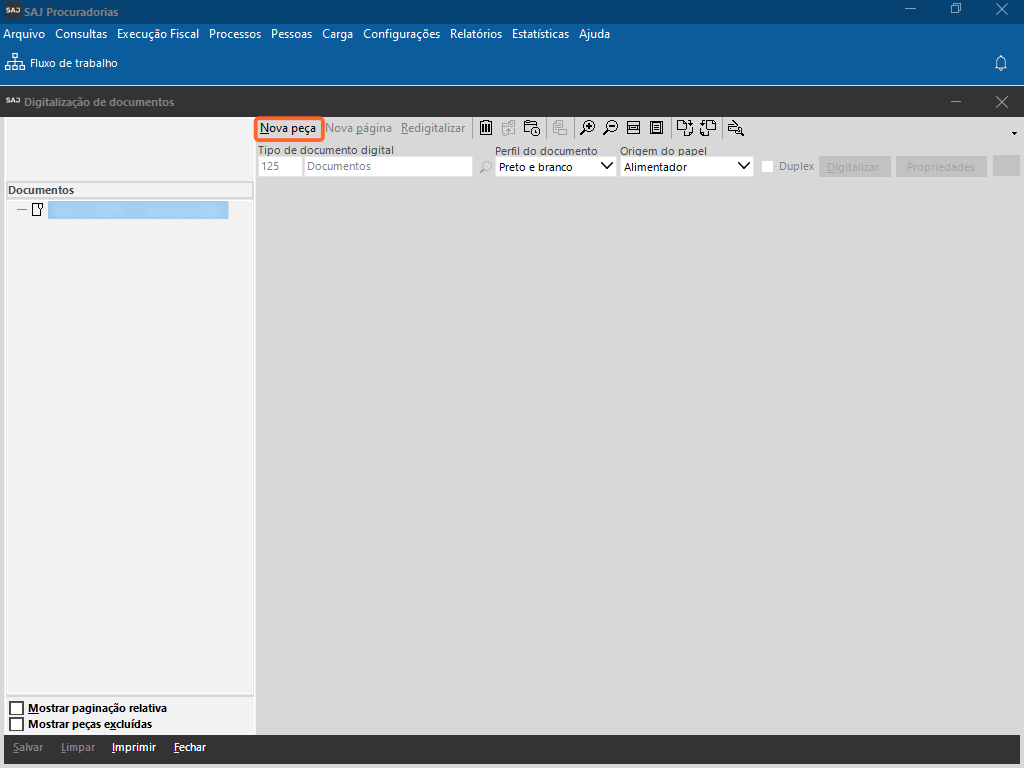 O sistema abrirá a tela de digitalização de peças processuais, clique em ‘Nova peça‘.